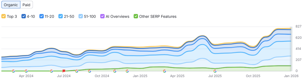 Site-ul avea vechime si a reactionat foarte bine la imbunatatirile aduse de noi. Am actionat atat on-page cat si off-page si rezultatul se poate vedea si in imaginea de mai sus, de unde tragem concluzia ca numarul de cuvinte cheie pentru care site-ul rankeaza aproape ca s-a dublat.